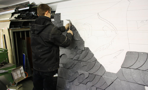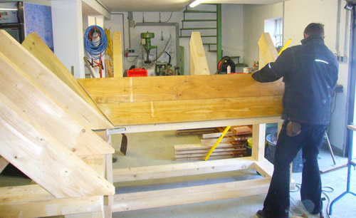 Die Auszubildenden bauen eine Holzkonstruktion eines Daches, um den Umgang mit Schiefer und Holz zu erlernen.