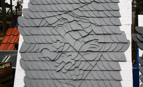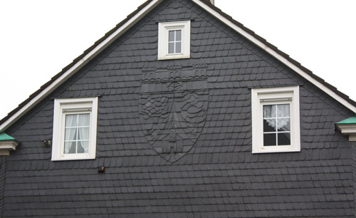 Beispiel für die Einbindung eines Wappen in die Schieferfront.