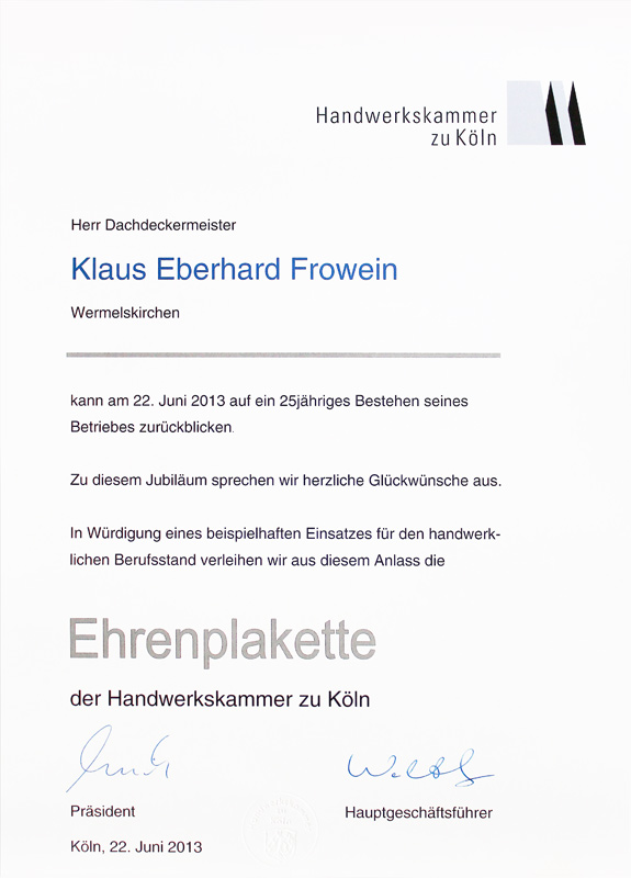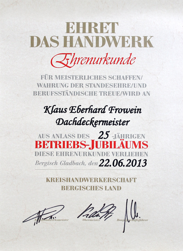 Ich freue mich sehr, dass mein Sohn Klaus Alexander nun mit Bestehen seiner Meisterprüfung am 02. November 2011 die Dachdeckerei Frowein in Wermelskirchen auch in der zukünftigen Generation weiterführen möchte.